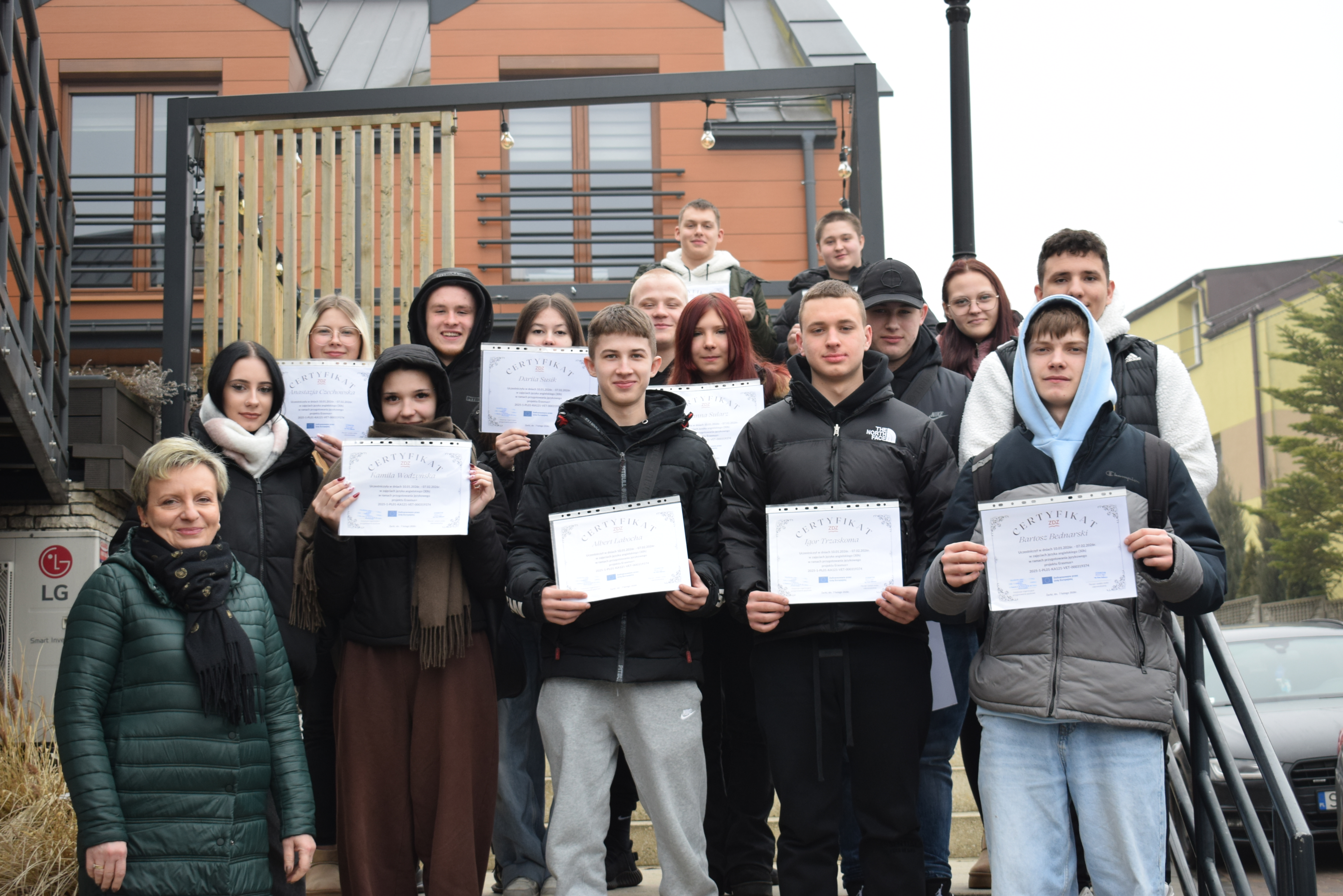 Od 10 stycznia 2026r. uczniowie zakwalifikowani do projektu Erasmus+ uczestniczą w 30 godzinach zajęć przygotowania językowego - języka angielskiego. Podczas zajęć uczniowie utrwalali słownictwo, zwroty grzecznościowe, ćwiczyli dialogi w różnych sytuacjach, wykonywali ćwiczenia interaktywne, ćwiczyli słownictwo zawodowe. Zajęcia w czasie wolnym od zajęć lekcyjnych prowadziła Pani Agnieszka Ratman - nauczyciel języka angielskiego. Przygotowanie językowe uczestnicy rozpoczęli i zakończyli testami wstępnym i końcowym, których wyniki opracowała i omówiła z uczestnikami Pani Ratman. Test zostanie przeprowadzony również po powrocie z praktyk. Podobnie test OLS na platformie EU Academy. Na zakończenie przygotowania językowego młodzież otrzymała odpowiednie certyfikaty.